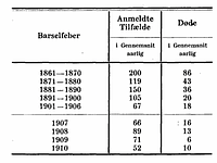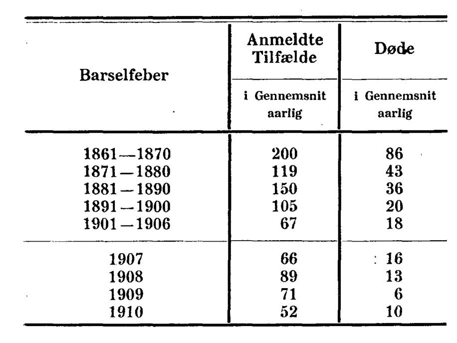 Før jeg gaar over til at sige Dem, hvad Jordemødrene har opnaaet i de svundne 40 Aar, vil jeg fortælle Dem noget om, hvad Gavn, det er lykkedes dem at gøre. Det er sagt med faa Ord, eller rettere med faa Tal, nemlig Tallene paa Barselfebertilfælde før og nu. Jeg er saa heldig at være i Besiddelse af Korrekturen paa Stadslægens sidste Beretning, den er nemlig ikke trykt endnu, og jeg har der en Fortegnelse over Barselfebertilfælde, der gaar saa langt tilbage som til 1861. Jeg skal her nævne disse Tal for Dem.1