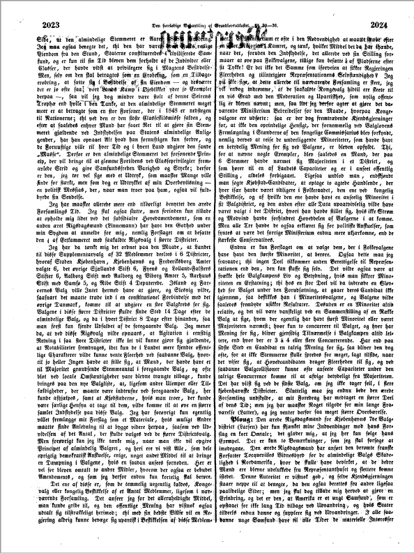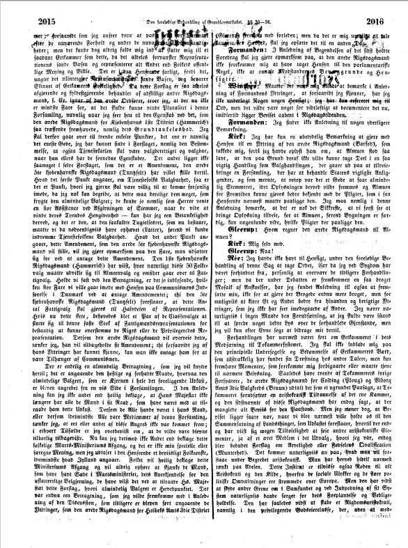 Forhandlingen har nærmest været ført om Eetkammeret i dets Modsætning til Tokammersystemet. Jeg skal ikke indlade mig paa den principielle Undersøgelse og Bedømmelse af Eetkammerets Værd, som tilstrækkelig har fundet sin Drøftning hos andre Talere, men kun fremhæve Momenter, som forekomme mig forbigaaede eller maatte tjene til nærmere Belysning. Saaledes have tvende af Tokammerets ivrige Forsvarere, de ærede Rigsdagsmænd for Colding (Ploug) og Viborg Amts 3die Valgkreds (Bruun) udtalt det som et ugrundet Paasagn, at Tokammeret forudsætter en aristokratisk Til[d]annelse af det ene Kammer, og den sidstnævnte af disse Rigsdagsmænd har endog sagt, at der manglede alt Beviis for den Paastand. Men jeg mener dog, at Beviset ligger saare nær, naar vi blot nærmest ville holde os til den Sammensætning af Landsthinget, som Udkastet foreslaaer, hvortil der endog har viist sig megen Tilbøielighed at fø[i]e andre aristokratiske Elementer, ja af et æret Medlem i det Udvalg, hvori jeg var, endog blev bebudet Forslag om Arvelighed eller Fødselens Kvalification (Munterhed). Det kommer naturligviis an paa, hvad man vil forstaae under Begrebet aristokratist. Man har herved hidtil nærmest tænkt paa Adelen. Dette Institut er tilvisse ogsaa Roden til alt Aristokrati og den Kilde, hvorfra de sociale Ulykker og de store politiske Omvæltninger ere strømmede over Europa. Men den har vidst at skyde andre Grene om i Samfundet og ved Indpodning af sit System naturligviis baade sørget for dets Forplantelse og Vedligeholdelse. Den har saaledes vidst at skabe et Rigdomsaristokrati, navnlig i den privilegerede Godseierclasse, der, uden at modtage Adelens Rettigheder, dog ved medfulgte „Herligheder“ har forstaaet, godt at hamle op med dens Knibskhed og Fornemhedssyge. Den har forplantet sig videre i et Embeds- og Rangaristokrati, der ogsaa har vidst at prunke ret godt med de af Adelen laante Paafuglefjer. Den har endelig forplantet sig endnu dybere ned i et af Laugsvæsen og Kaste-Smaalighed næret Spidsborger-Aristokrati, der, endskønt med Keitethed, dog paa det Bedste har stræbt at følge sit store standsadskillende Mønster. Jeg vil nu ingenlunde sige, at disse eller alle forskjellige Arter af Aristokrati have fundet deres Plads i Udkastets Førstekammer, men det er dog Tilfældet med de væsentligste af dem. Udkastet foreslaaer nemlig, at ingen Diæter skulle betales til Landsthingets Medlemmer. Det er den aabenbareste og en stor Begunstigelse af Rigdommen, og ikke blot af Rigdommen, men af den bedre gagerede Embedsclasse; thi uden Diæter kunne kun formuende Mænd og vellønnede Embedsmænd søge deres Plads i dette Thing, be Sidste saa meget mere, som Regjeringen kan begunstige deres Valg ved, hvad jeg veed endog faktisk er Tilfældet med Embedsmænd allerede i denne Forsamling, at der er bleven dem constitueret Andre til at varetage deres Embede, uden at de selv afholde Udgiften herved. Her ligger altsaa, uden andre Hensyn, et klart Beviis for et begunstiget Aristokrati. Dog vi behøvede ikke engang at søge Beviserne; selv Opinionen taler for, kun at ville finde et aristokratisk Element i det høiere Kammer. Vi behøve endog kun at see hen til Stændertiden. Vore Stænder vare deelte i Kamre paa forskjellige Steder, udgjorde altsaa, hvad det egentlige Danmark angaaer, en Art Tokammer, af hvilke Opinionen stedse betegnede der jydske som det folkelige, uagtet dette Tillægsord ofte kun meget ringe tilkom det, og Østifternes som det aristokratiske, og det endskjøndt de begge dog vare sammenfatte af de samme Valgelementer; men en større Samling af Aristokrati, ubgaaet af dettes Corporationer, havde faaet Sæde i det ene.