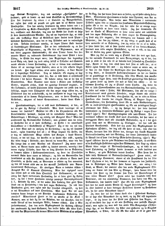 Ja, man har vel her bladet stærkt efter i Historiens Aarbøger, for at søge efter Vidnesbyrd for og imod, og jeg skal vist ingenlunde negte, at jeg sætter saa stor Priis paa Historien som Nogen, at jeg af den stedse har søgt at øse min Forskning over politiske Spørgsmaal; men ogsaa jeg maa med den ærede 28de Kongevalgte (Tscherning) sige, at den Autoritet, jeg stiller over Historien og de Klogestes Vidnesbyrd, er Tiden, der ofte ikke blot nøder os til at gjøre store Spring, men endog ofte bibringer os et saa uvilkaarligt Stub, at selv den med Podagra meest Belemrede maa bevæge sig fremad. Desuden er der en væsentlig, maaskee den væsentligste Betragtning, som hos ethvert Folk maa rage frem: Folkets Eiendommelighed. Den har hos os fra den tidligste Tid til de sidste Dage stedse vidnet for Tilbøieligheden til et Eetkammer. Jeg vil ikke blot støtte mig paa, at i Valgdagene, saavidt mig bekjendt, paa de fleste Steder, hos Vælgere og Candidater, udtalte sig det almindelige Ønske for et Eetkammer. Af enkelte Candidater blev jo vel bemærket, at de ikke med Bestemthed vilde erklære sig for eet eller to Kamre, men nu først see sig om inde i Rigsforsamlingen og saa stemme efter deres inderste Overbeviisning; men hos Vælgerne viste desuagtet Tilbøieligheden til Eetkammeret sig at være den meest fremtrædende. Den har ogsaa maattet være den eiendommelige for vort Folks Tankegang, hvilket navnlig har viist sig under Stænderne, idet det dog var det Eneste, der endnu bevarede Interessen noget for denne Institution i dens hensygnende, ja næsten henvisnede Tilstand, at Folkets Repræsentanter, rigtignok hver sin uheldige Provindsdeling, vare samlede uden Hensyn til Classeforskjel i eet Kammer til fælles Raadslagning og Beslutning. Ja den eiendommelige Trang hos os til et Eetkammer har jo endog nedarvet sig i den Grad, at mange af denne Forsamlings Medlemmer i deres Tilbøielighed hertil have kunnet endog stige ned til et Eetkammer, sammensat paa den Maade, som det foreliggende Mindretalsforslag indeholder, ja at endog, endskjøndt Udkastets Tokammer dog har et temmelig liberalt Tilsnit, et Medlem fra Ringkjøbing Amt (Kirk) har kunnet foretrække, hellere at skyde ogsaa det liberalere Tokammer tilbage, og idet Sted vælge — den gamle graar Absolutisme!