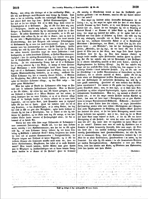 Endnu har man villet finde noget Tilsvarende til Tokammeret i vore communale Indretninger. Ganste vist, der har man Tokammeret, navnlig i vore Kjøbstadcommuner; men har det da ikke ogsaa viist sig, at dette Tokammer stadigt befinder sig ved denne Tvedeling og Udstillelse i indbyrdes Strid? Endog Lovgiveren har forudsat dette ved at paabyde Sammentræden i Uenighedstilfælde, før Sagerne indgaae med Dissents til høiere Afgjørelse; og er ikke det tvistende Clement ofte fremtraadt maaskee meest netop der, hvor det høiere Kjøbstadkammer, Magistraten, kun bestod af en eneste Embedsmand? Man betænke desuden, hvilket Middel man giver ihænde paa de Mægtigere og Indflydelsesrigere ved at kunne benytte Uenigheden imellem de to Kamre til sin Fordeel! Hver let formaaer ikke navnlig et Ministerium derved at faae sin Indskydelse gjort stærkere gjældende i det ene Kammer, naar det ikke har kunnet opnaar det i det andet?
