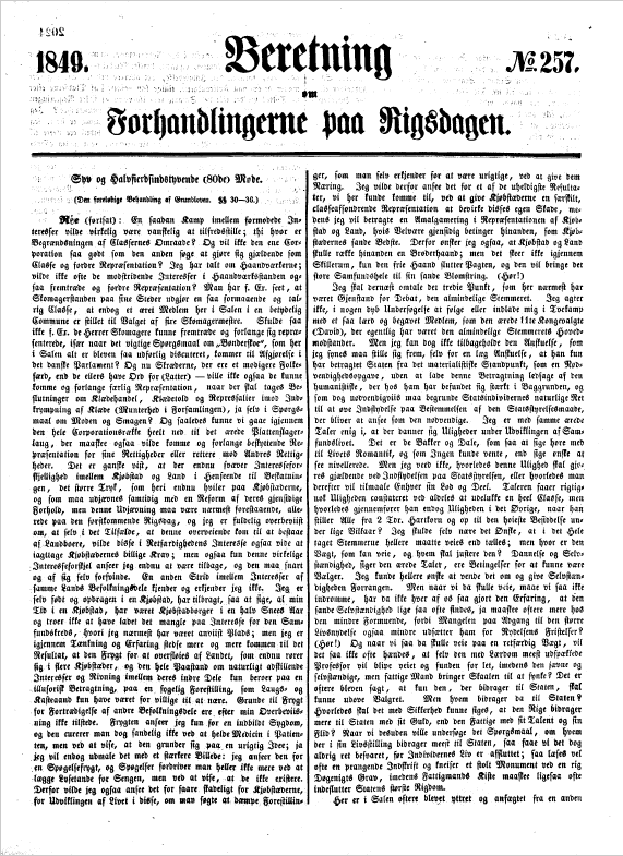 Saa meget jeg saaledes altsaa foretrækker Eetkammeret for en Deling i to, og saa meget det ogsaa altid har hørt til mine skjønne politiske Drømme og kjære Tanker, at vi, naar Friheden engang forkyndtes hos os, maatte see den kundgjøre sig ved en Samling af Landets Blomst i eet Kammer til fælles Raad og fælles Beslutning; saa meget jeg saaledes har ønsket, at see ogsaa hos os en Nedkomst med dette Foster af Friheden og Tiden: saa vilde jeg dog føle mig ubehagelig overrasket ved at skulle betragte det — ja jeg maa sige det, endskjøndt Tilværelsen skyldes et af de skarpsindigste Medlemmer i Forsamlingen, den Mand, til hvis Ord jeg selv altid gjerne lytter — „det Misfoster”, som det her foreliggende Forslag udviser, „Misfoster„ [sic] har jeg sagt, thi det bærer ikke blot et lidet Hoved til Stue paa en stor Krop, men begge Dele synes ligesom fabrikerede hver for sig, og siden satte sammen (Latter) og mangle derfor maaskee ogsaa Forbindelsen imellem Hjerte og Hjerne. Jeg skal ikke her opholde mig ved det Principløse i hele Forslaget; det er allerede tilstrækkelig paaviist af flere ærede Talere, navnlig af Rigsdagsmanden for Colding (Ploug). Jeg skal kun opholde mig noget ved den praktiske Side deraf, navnlig den, som angaaer de formeentlige Classer i deres indbyrdes Forhold. Jeg vil ikke tale om det Overflødige i en særskilt Repræsentation af Universitetet og lærde Institutter; det er allerede paaviist af Andre. Heller ikke vil jeg dvæle videre ved Geistlighedens særskilte Repræsentation, som jo allerede ved Folkevalgene til nærværende Forsamling har vist sig at være ganske unødvendig. Hvorledes vil man desuden faae Geistligheden repræsenteret? Det maatte jo ikke gjælde den kongelig privilegerede Statskirke alene; men, da man siger, at vi skulle have Religionsfrihed og altsaa religieus Ligeberettigelse, ligesaa udvides til alle dissentierende Troesbekjendere. Men det, jeg nærmest et Øieblik vil standse ved, er det saa meget omtalte Forhold imellem Kjøbstad og Land, som man vil have taget i Betragtning ved at give Kiøbstæderne en særegen Repræsentations-Beskyttelse. Beskyttelse — hvorimod? Flere af de ærede Talere have selv erkjendt, at nogen Interesseforskjel fremtidigt mindre vilde være tilstede i Virkeligheden end i Frygten. Den ærede Rigsdagsmand for Nykjøbing paa Falster (Mørk Hansen) har saaledes selv yttret, at for den høiere Betragtning maatte denne Frygt forsvinde som ugrundet; men er det, hvad jeg for en Mand med hans Aand neppe behøver at styrke, er det da ikke den høiere Betragtning af alle Forhold, der netop her under vore Overveielser maa lede os? Og naaer man vel nogensinde det høiere Maal ved at see nedad? Desuden naar man vil tænke sig Kjøbstaden som et Compler af fælles formeentlig Interesse, feiler man meget, thi Striden føres ofte i den imellem forskjellige næringsdrivende Stænder, navnlig Handelsstanden imod Haandværksstanden; det viser sig især ved de communale Valg, hvor ofte Kjøbmændene forsamle sig i een Klub for at aftale Candidaturer, Haandværkerne i en anden, og saa fremdeles. Det viser sig ikke mindre i de ofte fremtrædende Brydninger imellem Næringsinteresserne. Kjøbmanden er vred paa Skræderen, fordi han handler med Klæde, og Skræderen paa Kjøbmanden, fordi han handler med syede Klæder.